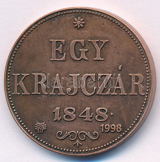 https://www.darabanth.com/en/444-Online-auction/444.0/Numismatics/Hungarian-coins-and-coins-with-Hungarian-mint-marks~1000008/1848KB-1Kr-Cu-1998-as-jubileumi-utanveret-restrike-TAU-XF~II2926755