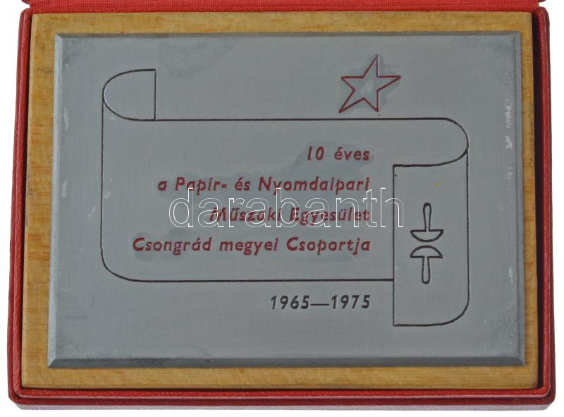Description: 1975. "10 éves a Papír- és Nyomdaipari Műszaki Egyesület Csongrád megyei Csoportja 1965-1975" fém plakett fatáblán, eredeti tokban (78x106mm) T:AU ragasztás elengedett