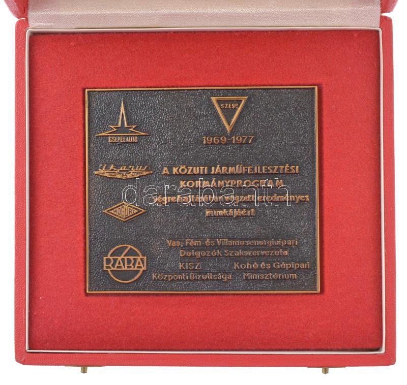 Description: 1977. "1969-1977 - A közúti járműfejlesztési kormányprogram végrehajtásában végzett eredményes munkájáért - Vas-, Fém-, és Villamosenergiaipari Dolgozók Szakszervezete - KISZ Központi Bizottsága - Kohó és Gépipari Minisztérium" egyoldalas bronz plakett eredeti tokban (100x88mm) T:UNC