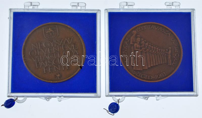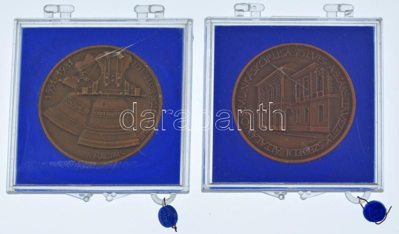 Description: 1981. "A Magyar Éremgyűjtők Egyesülete / Négyszázötven éve világít a pápai Schola fénye" bronz emlékérem plombált, sérült "ÁPV" tokban (42,5mm) + 1983. " ,,Miénk az élet tavasza" - Juhász Gyula / 75 éves a Szakszervezetek Szegedi Általános Munkáskórusa" bronz emlékérem plombált, sérült "ÁPV" tokban (42,5mm) T:UNC