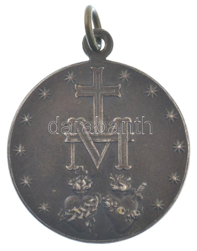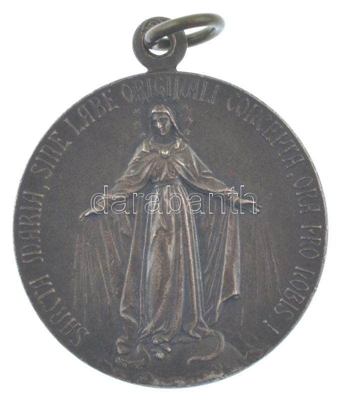 Description: ~1930. Máriát ábrázoló, kétoldalas ezüstözött bronz vallási érem füllel. "SANCTA MARIA SINE LABE ORIGINALI CONCEPTA, ORA PRO NOBIS!" (32mm) T:AU,XF patina