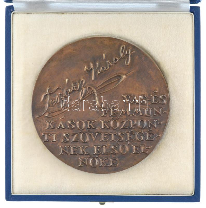 Description: Kiss Nagy András (1930-1997) DN "Teszársz Károly - Vas- és Fémmunkások Központi Szövetségének első elnöke" kétoldalas bronz plakett, eredeti dísztokban (109mm) T:AU