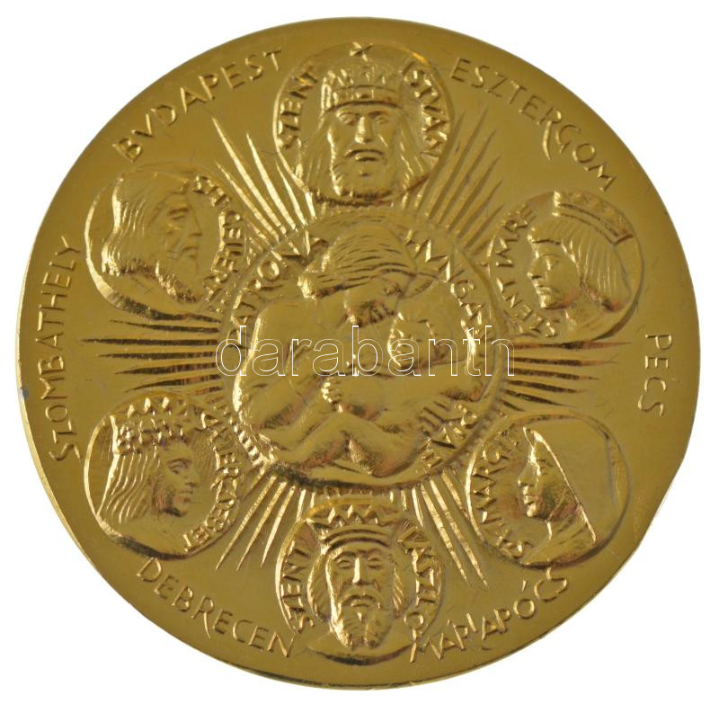 Description: Tóth Sándor (1933-) 1991. "JOANNES PAVLVS II P M IN HVNGARIA XVI XX AVG MCMXCI / BUDAPEST ESZTERGOM PÉCS MÁRIAPÓCS DEBRECEN SZOMBATHELY" aranyozott bronz emlékérem műanyag tokban II. János Pál pápa magyarországi látogatása alkalmából (42,5mm) T:AU ph.