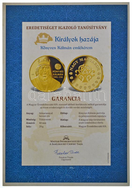 ifj. Szlávics László (1959-) 2011. "Nagy Magyarok / Könyves Kálmán" aranyozott Cu emlékérem tanúsítvánnyal (40mm) T:PP