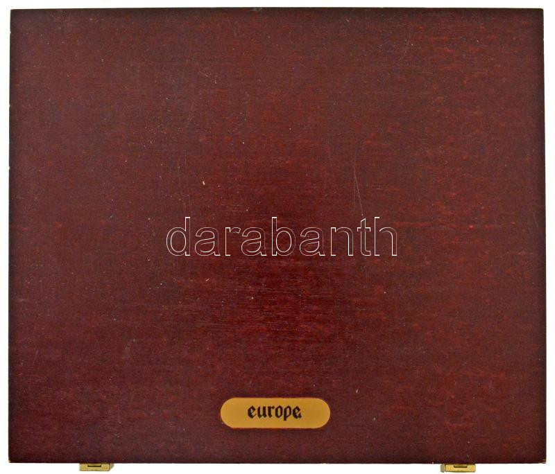 Faborítású éremtartó kazetta (~270x230mm), 12 férőhellyel (52x52mm átmérőjű fészkekkel), "EUROPA" sárgaréz táblával. Használt, de jó állapotban