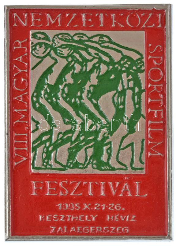 1985. "VIII. Magyar Nemzetközi Sportfilm Fesztivál - Keszthely, Hévíz, Zalaegerszeg" egyoldalas, festett fém plakett eredeti tokban (69x94mm) T:AU