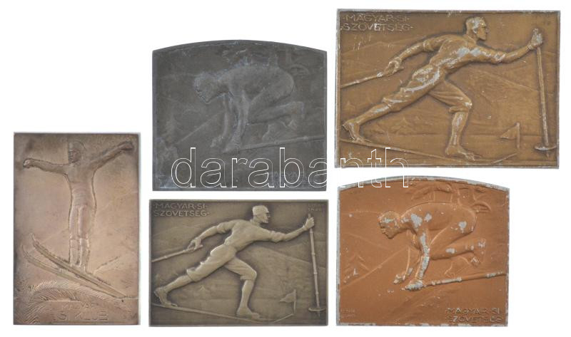 Description: Berán Lajos (1883-1943) 1929. "Magyar Sí Klub" ezüstözött bronz díjplakett (39x60mm) + 1934-1948. 4db-os "Magyar Sí Szövetség" sí díjplakett-tétel, benne bronzozott Al, hadifém és ezüstözött bronz T:XF,VF