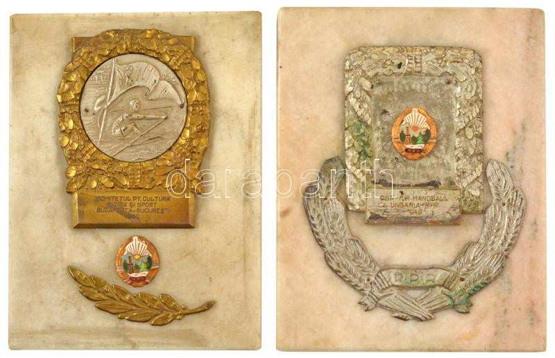 Romania 1949. "Hungary-Romania handball match" metal plaque on marble plinth with enameled coat of arms of the Romanian People's Republic (126x160x20mm) + 1950. "Budapest-Bucharest cultural and sports competition" metal plaque on marble plinth with enameled coat of arms of the Romanian People's Republic (120x160x18mm) C:XF