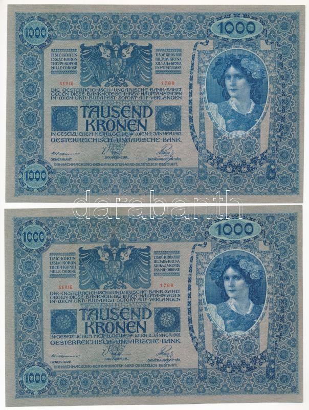 Ausztria 1919. (1902) 1000K (2x) sorszámkövetők "1768 02774-02775", függőleges "DEUTSCHÖSTERREICH" felülbélyegzéssel, mindkét oldal német T:I-,II az egyiken kis beszakadás, folt