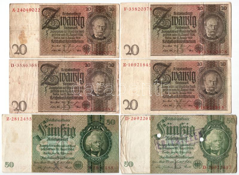 Description: Német Birodalom 1929. 20M (4db) + 50M (2db, egyik lyukasztással és magyar nyelvű "ÉRTÉKTELEN" felülbélyegzéssel) T:III,III-