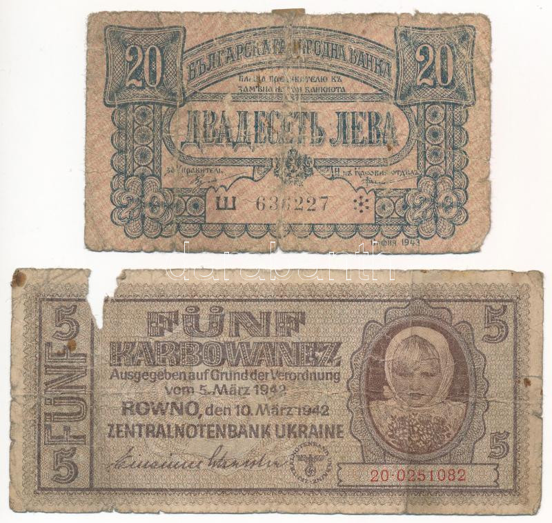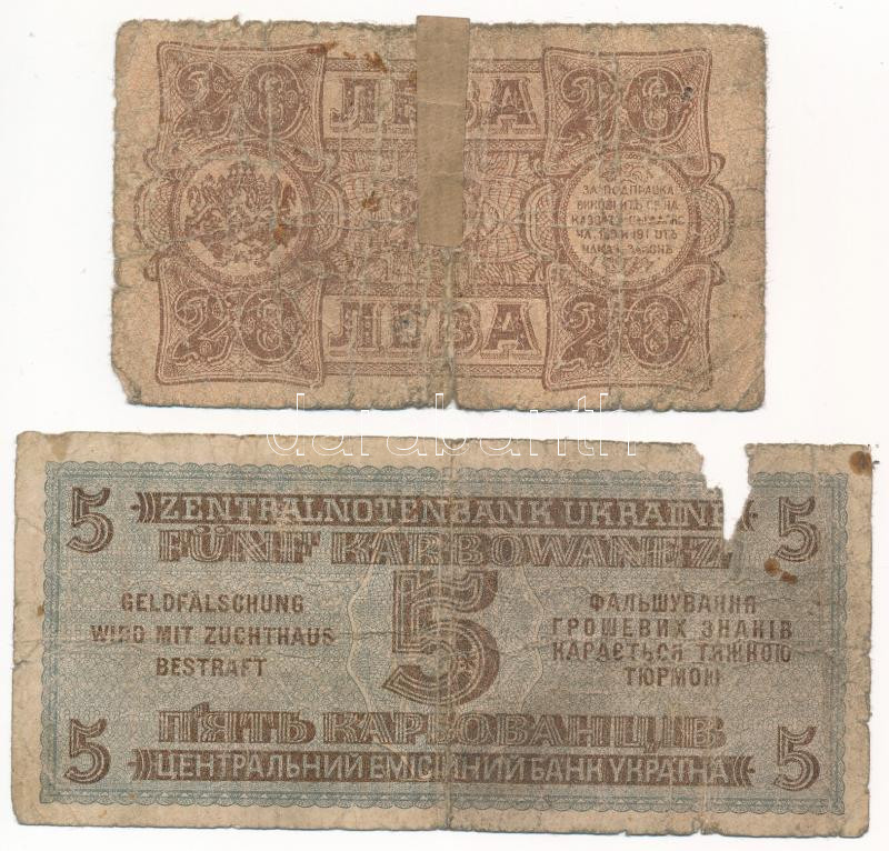 Orosz Birodalom 1912-1917. (1898) 1R Szign.: Shipov + 1912-1917. (1905) 3R Szign.: Shipov + 1912-1917. (1909) 10R Szign.: Shipov + Ukrajna / Német megszállás 1942. 5K + Bulgária 1943. 20L T:F-G Russian Empire 1912-1917. (1898) 1 Ruble Sign.: Shipov + 1912-1917. (1905) 3 Rubles Sign.: Shipov + 1912-1917. (1909) 10 Rubles Sign.: Shipov + Ukraine / German occupation 1942. 5 Karbowanez + Bulgaria 1943. 20 Leva C:F-G