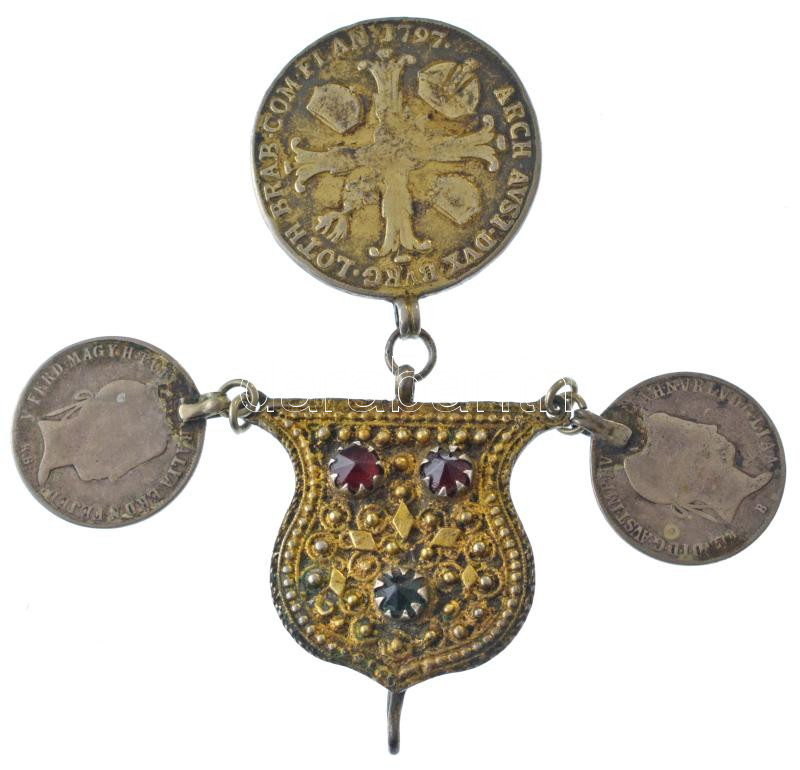 Osztrák Németalföld 1797G 1 Korona Tallér Ag "II. Ferenc" + Magyarország 1842B 20kr Ag "V. Ferdinánd" + 1848KB 20kr Ag "V. Ferdinánd" mindhárom érme közös, műköves függőn T:F