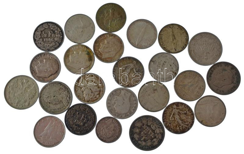 Vegyes 24db-os kisezüst érme tétel, benne Kanada, Svájc, Franciaország, Egyesült Államok, Német Birodalom, Szerbia, Orosz Birodalom Mixed 24pcs of small silver coin lot with Canada, Switzerland, France, USA, German Empire, Serbia, Russian Empire