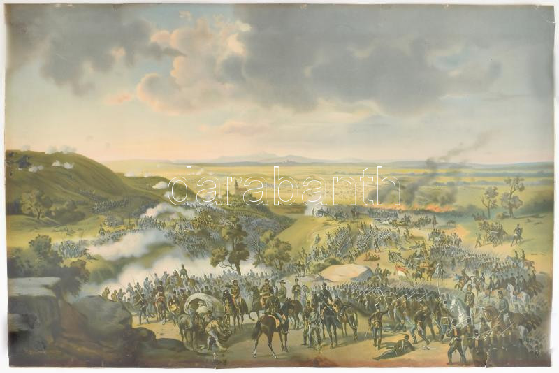 Description: Theodor Breitwieser (1847-1930) festménye után: Komárom felszabadítása a szabadságharc idején, 1849-ben. Kromolitográfia, papír, jelzett a metszeten. Feltekerve. Kissé sérült. Kissé foltos. 58x87 cm