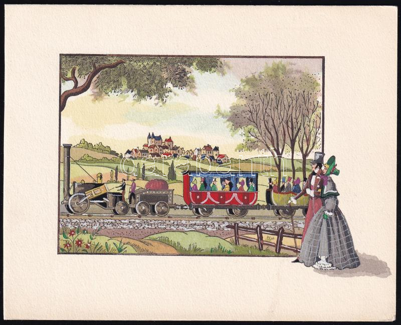 Jelzés nélkül: A vasút hőskorszaka. Akvarellel színezett metszet. Lapméret: 11,5x14,5 cm