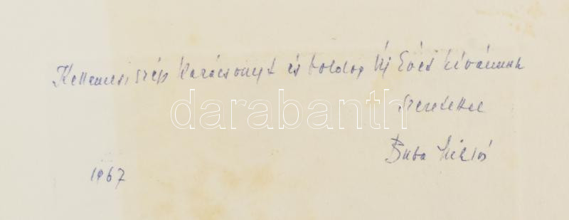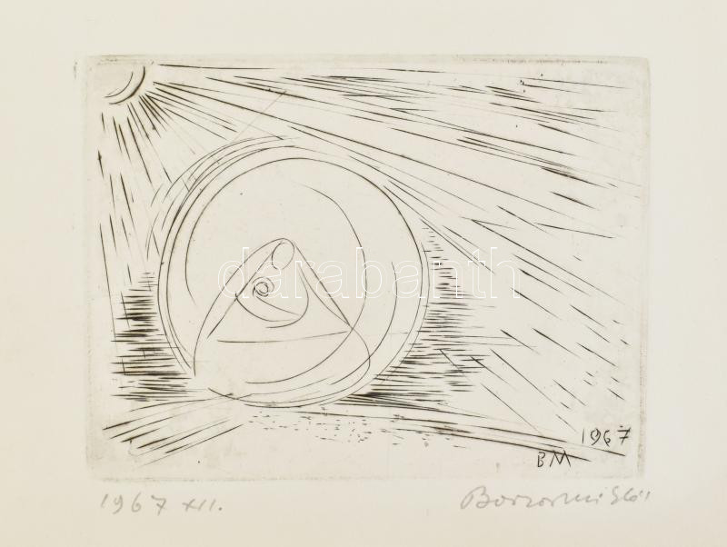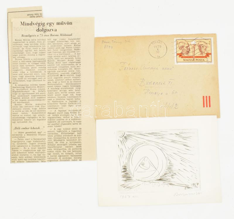 1967 Borsos Miklós (1906-1990):Napfényyben, rézkarc, papír, jelzett, 8x10,5 cm. Borítékkal, rajta a feladó, Borsos Miklós címével (1979 Borsos, Tihany, Diós 8237.) Róla szóló cikkel.