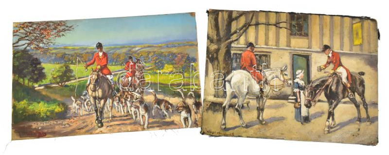 Fluck Béla (1889-?): 2 db lovasokat (vadászokat) ábrázoló festmény. Olaj, vászon/karton, sérülésekkel, 21x33 cm és 23x31 cm