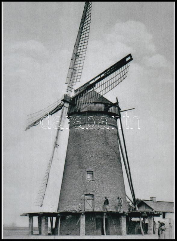 1926 Túrkeve, ún. bástyás szélmalom annyiban tért el az egyéb tÃpusoktól, hogy az elsÅ‘ emelete szintjében kÃvülrÅ‘l erkélyszerű körjárat övezte, errÅ‘l kezelték a tengely kapcsolóját, ezen járva fordÃtották szélirányba a vitorlákat, 1 db modern nagyÃtás, 21x15 cm / windmill, modern copy of vintage photo