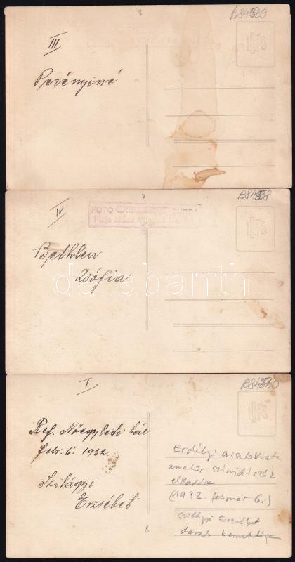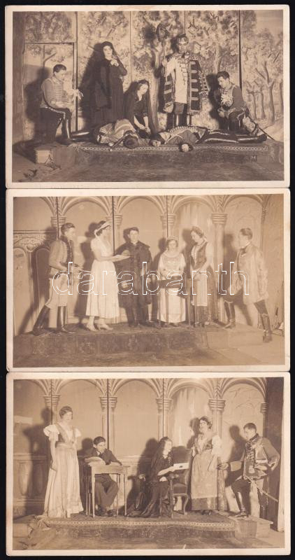 1932 Torda (Turda), Református nőegyleti bál, erdélyi arisztokrata amatőr színjátszók előadása, Szilágyi Erzsébet c. darab bemutatója, 3 db fotó (Szilágyi Erzsébet, Perényiné, Bethlen Zsófia), a hátoldalon feliratozott, pecséttel jelzett, 14x9 cm