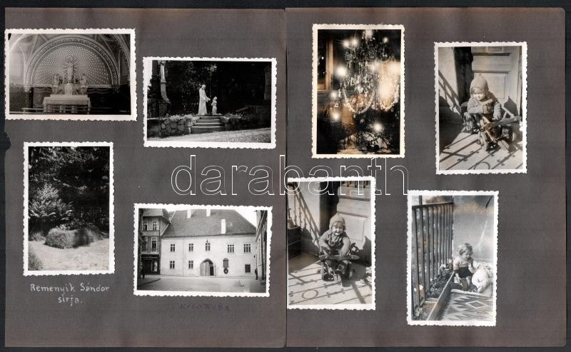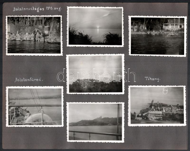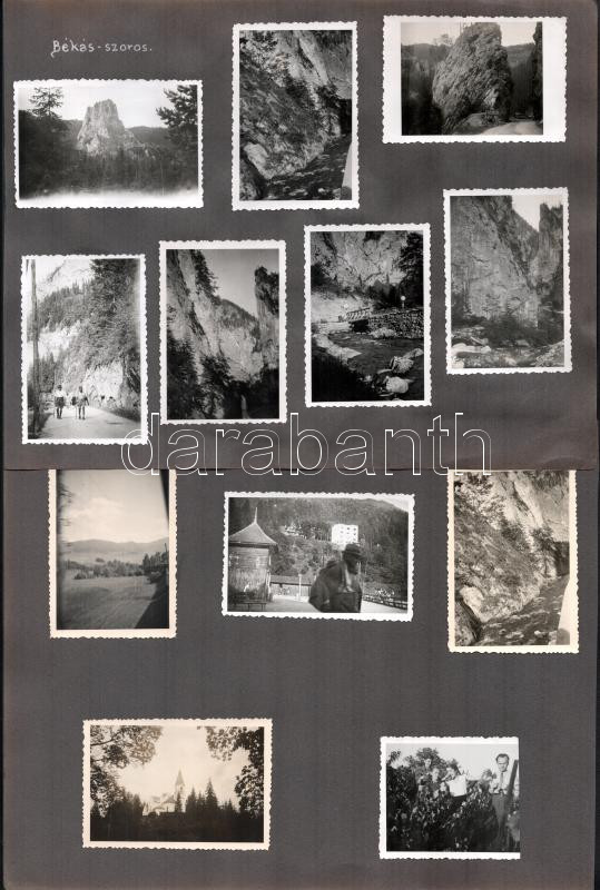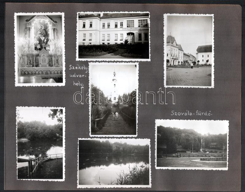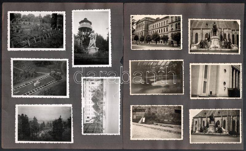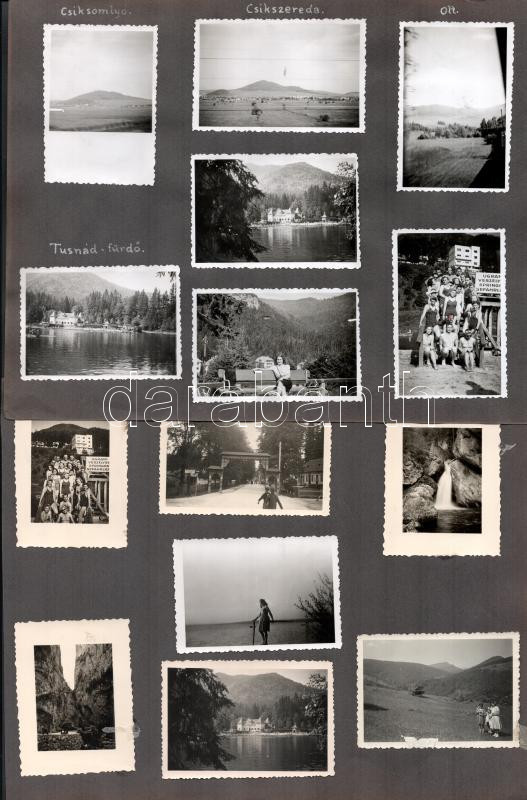 cca 1940 Erdélyi és balatoni településeket, tájakat ábrázoló fotók: Kolozsvár, Csíkszereda, Csíksomlyó, Tusnádfürdő, Békás-szoros, Olt folyó, Székelyudvarhely, Szováta; Balatonfüred, Tihany, Balatonvilágos. 59 db fotó, albumlapokra ragasztva, 9x6 cm méretben.