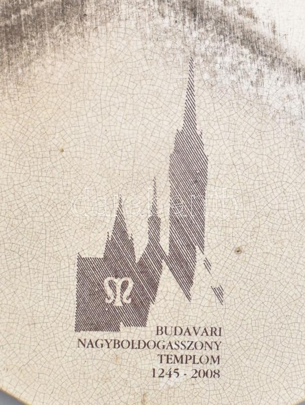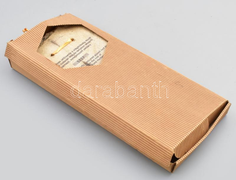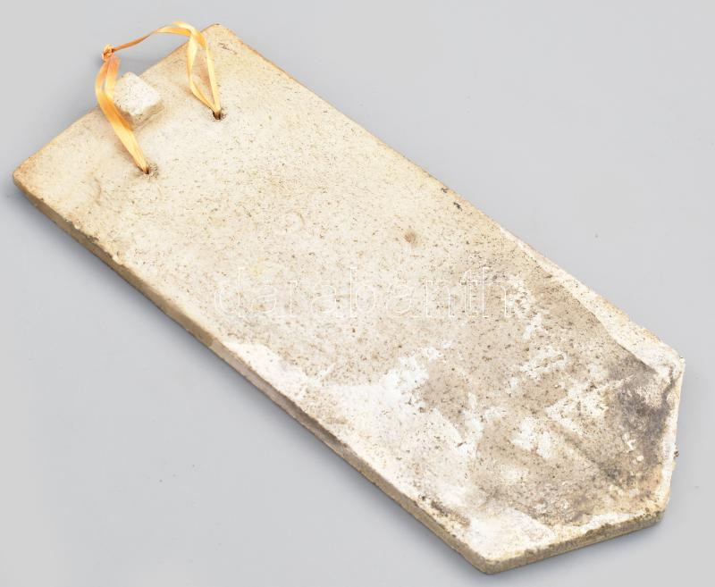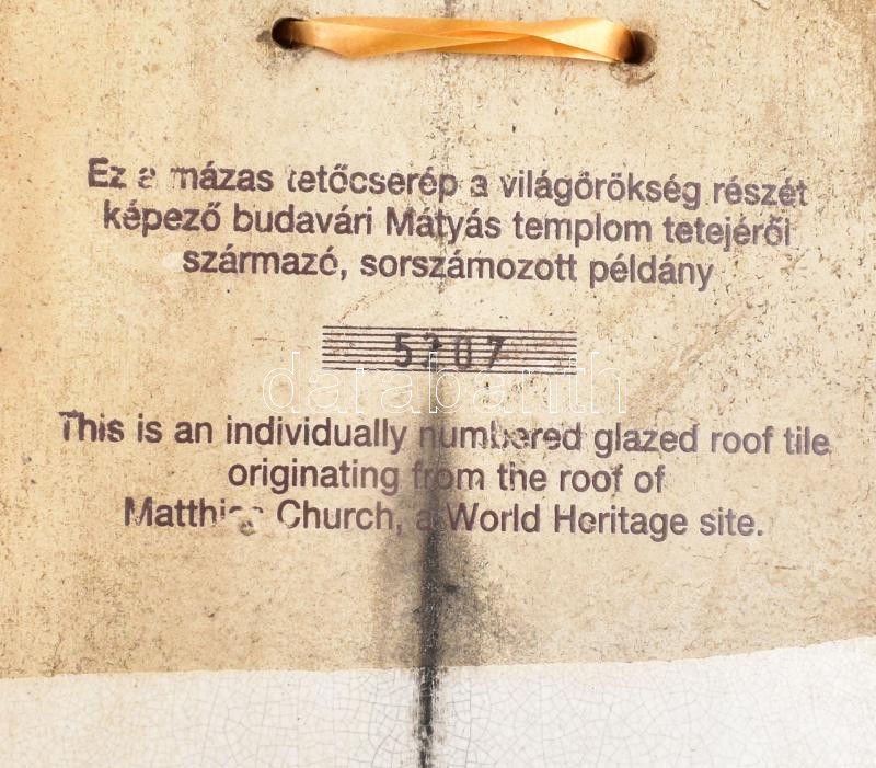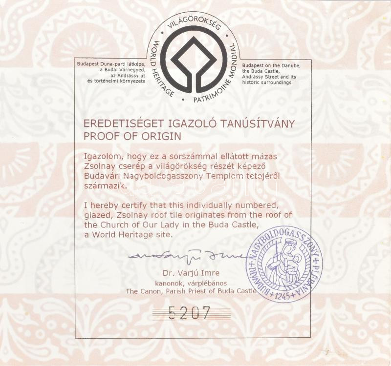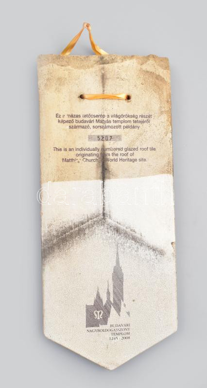 A budavári Nagyboldogasszony templom tetejéről származó Zsolnay-mázas tetőcserép, sorszámozott példány, eredetiségigazolással, rövid ismertetővel, hullámpapír védőtokban, 35×14,5 cm / Original, glazed Zsolnay roof tile from the Church of Our Lady in Buda Castle, numbered, with certificate of origin