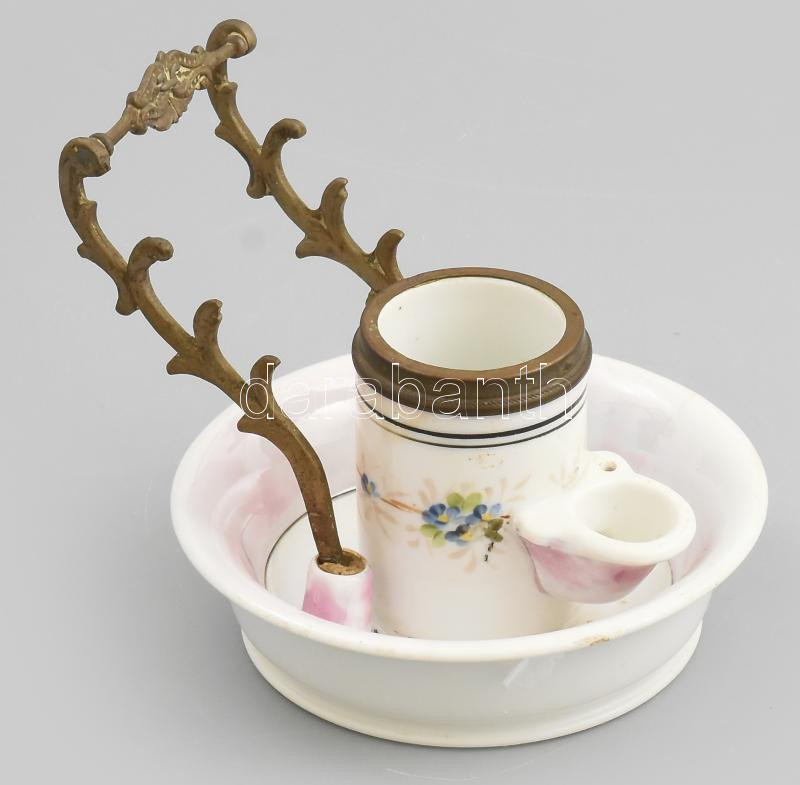 Antik porcelán tinta- és tolltartó, réz szerelékkel, kopással, kis hajszálrepedésekkel, kézzel festett, jelzés nélkül, d: 13 cm, m: 12 cm