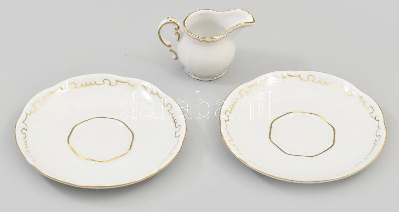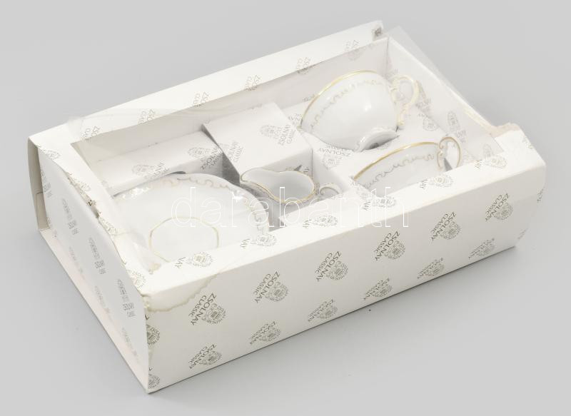 Zsolnay tollas mintájú két személyes mokkás készlet: két csésze, aljjal, tejszín kiötő. Kézzel festett, jelzett, hibátlan. Eredeti dobozában.