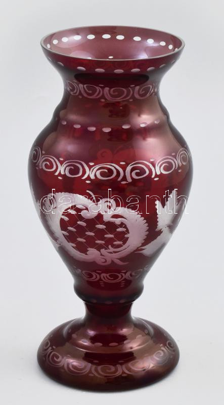 Bíborszín hámozott, metszett üveg váza. Hibátlan 21 cm