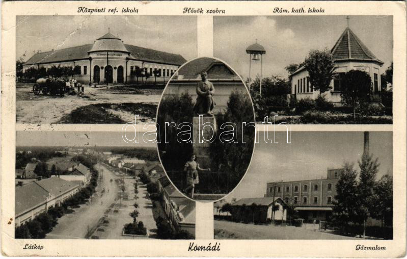 1940 Komádi, Hősök szobra, emlékmű, Központi református iskola, Római katolikus iskola, gőzmalom (EB)