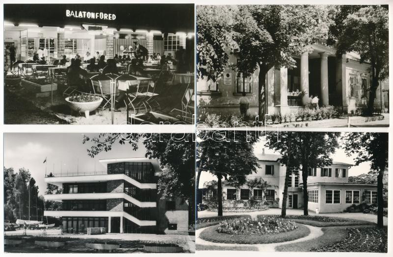 Balatonfüred - 8 db modern Képzőművészeti Alap 1,20 és 1,40 Ft-os képeslap (KIOSZ üdülő társalgója, Pedagógus üdülő, Vasas sportház, Blaha Lujza volt üdülője, Arany Csillag szálló, Utasellátó, Baricskai borpince)