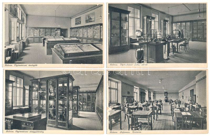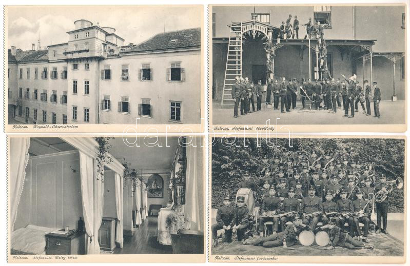 Description: Kalocsa - 15 db régi képeslap füzetből (Haynald obszervatórium, Stefaneum belső a beteg teremmel, hálóteremmel, ásványtár és fizikai szertár, tűzoltóság és fuvózenekar)