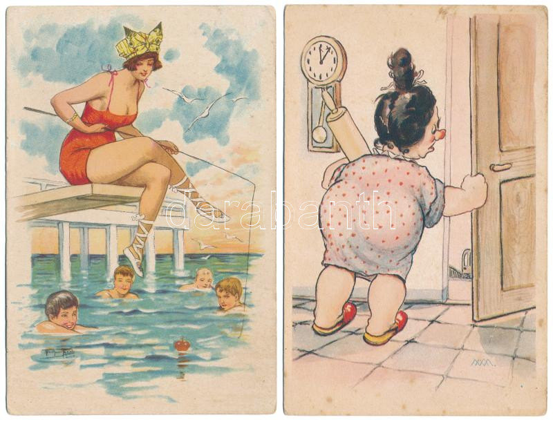 7 db RÉGI humoros rajzos képeslap vegyes minőségben / 7 pre-1945 funny postcards in mixed quality
