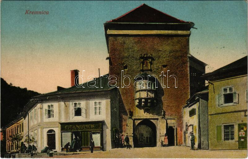 Körmöcbánya, Kremnitz, Kremnica; Városkapu tér, F. Tandlich üzlete / city gate, square, shops