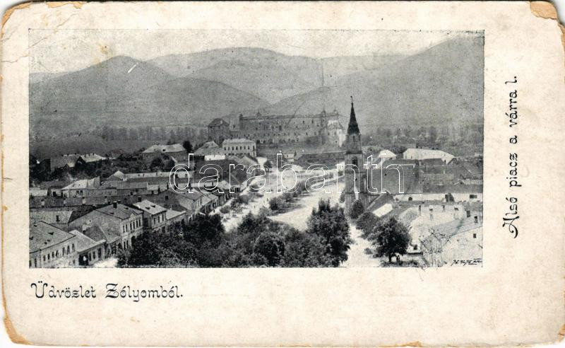 Zólyom, Zvolen; Alsó piac a várral / main square, castle (EM)