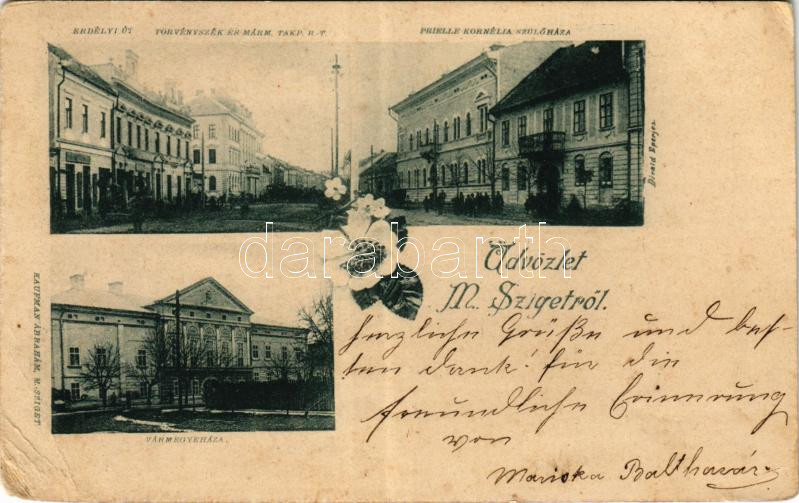 1898 (Vorläufer) Máramarossziget, Sighetu Marmatiei; Erdélyi út, Törvényszék, Takarékpénztár, Vármegyeháza, Prielle Kornélia szülőháza. Kaufman Ábrahám kiadása / street view, court, savings bank, county hall, birthplace of Kornélia Prielle (Hungarian actress). Art Nouveau, floral (EM)