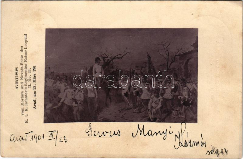 Description: 1901 Arad, Gruss vom Mortara und Novara-Feste des K.u.K. Infanterie Regimentes Kaiser Leopold II. No. 33. Arad, am 23. März 1901 / Üdvözlet a Mortara és Novara Ünnepről / Austro-Hungarian K.u.K. military parade (fl)