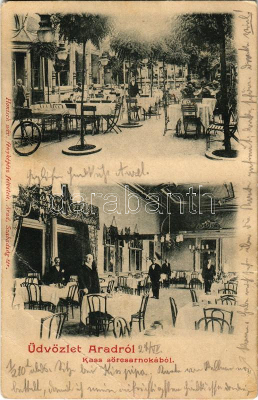1901 Arad, Kass sörcsarnoka, terasz és belső pincérekkel. Honisch udvari fényképész felvétele / beer hall, terrace and interior with waiters (r)