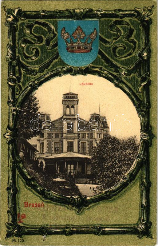 Brassó, Kronstadt, Brasov; Lövölde. Szecessziós litho keret címerrel / shooting hall. Art Nouveau, litho frame with coat of arms (b)