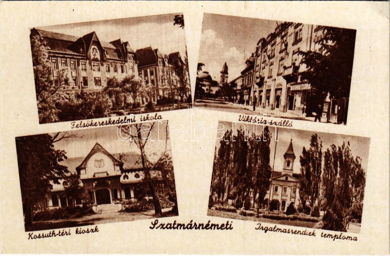 Description: Szatmárnémeti, Szatmár, Satu Mare; Felső kereskedelmi iskola, Viktória szálloda, Kossuth téri kioszk, Irgalmas-rendiek temploma / school, hotel, kiosk, church (EK)