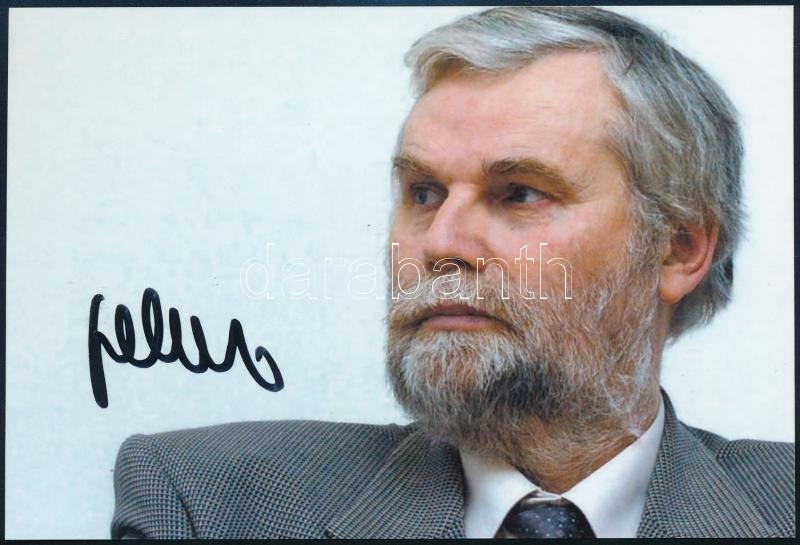Mellár Tamás (1954-) közgazdász aláírása az őt ábrázoló fotón