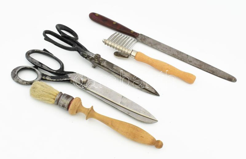 2 db nagy szabó olló, régi ecset, élező, szerszám