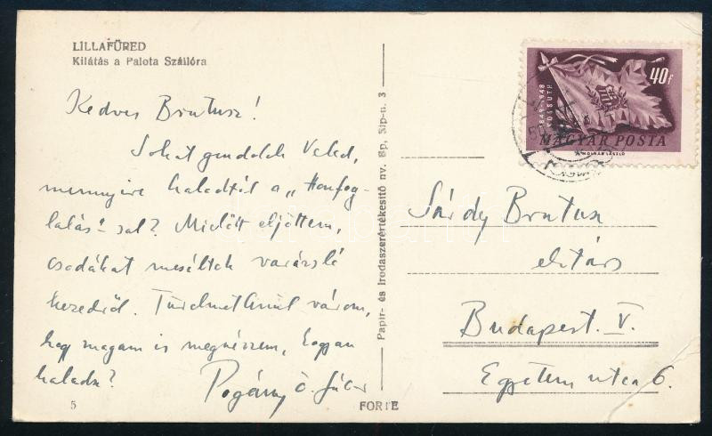 1950 Pogány Ö. Gábor (1916-1998) művészettörténész, a FÅ‘városi Képtár igazgatója, a Magyar Nemzeti Galéria késÅ‘bbi fÅ‘igazgatójának autográf sorai Sárdy Brutus (1892-1970) festÅ‘művész, restaurátor részére, amelyben érdeklÅ‘dik Munkácsy Mihály (1844-1900) Honfoglalás c. festményének restaurálásáról. Postázott képeslapon, Pogány Ö. Gábor autográf aláÃrásával. 8,5x14 cm