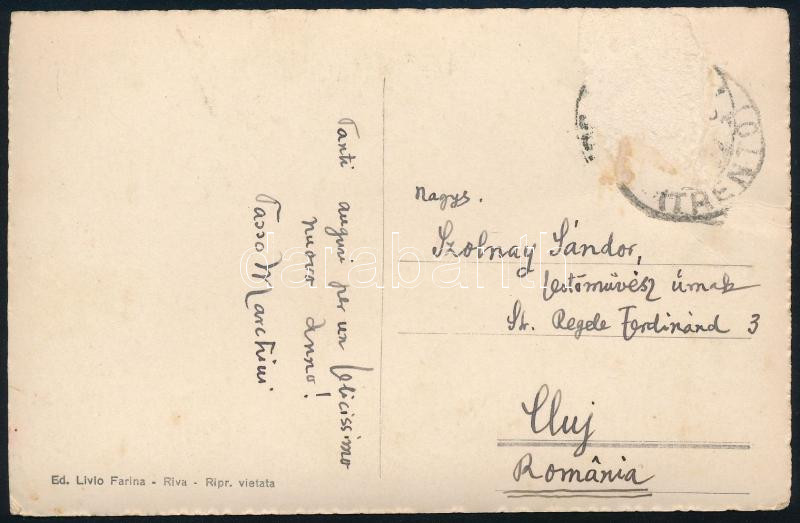 Description: Tasso Marchini (1907-1936) olasz-szerb származású erdélyi festőművész autográf aláírása és olasz nyelven írt sorai Szolnay Sándor (1893-1950) festőművésznek címzett képeslapon