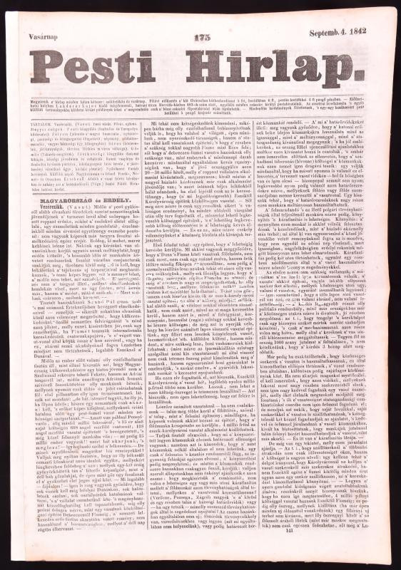 1842 Pesti Hírlap 175. sz. Septemb. 4. 1842. Szerk.: Kossuth Lajos. Pest, Landerer Lajos, javított gerinccel, hajtásnyommal, 631-638 p. Benne korabeli hírekkel, érdekes írásokkal, korabeli reklámokkal, gőzhajómenetrendekkel, gabonaárakkal.