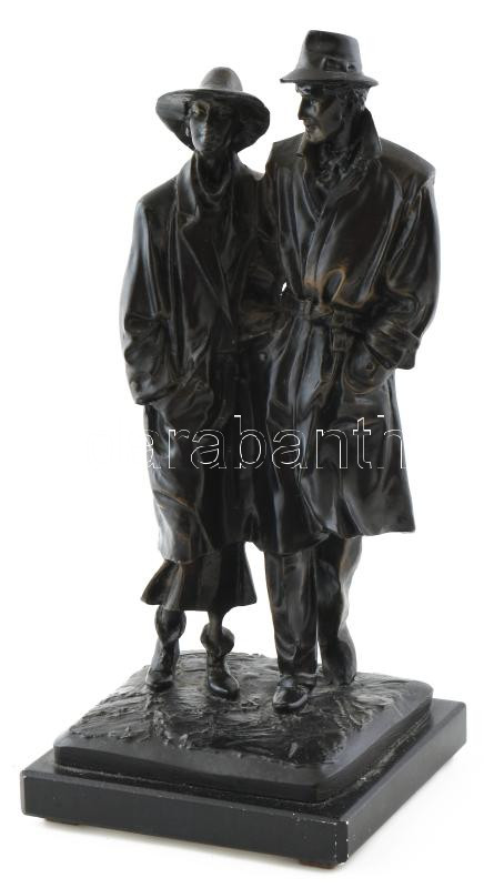 Kalapos férfi és nő, műgyanta szobor márvány talapzaton, jelzés nélkül, kopással, m: 26 cm
