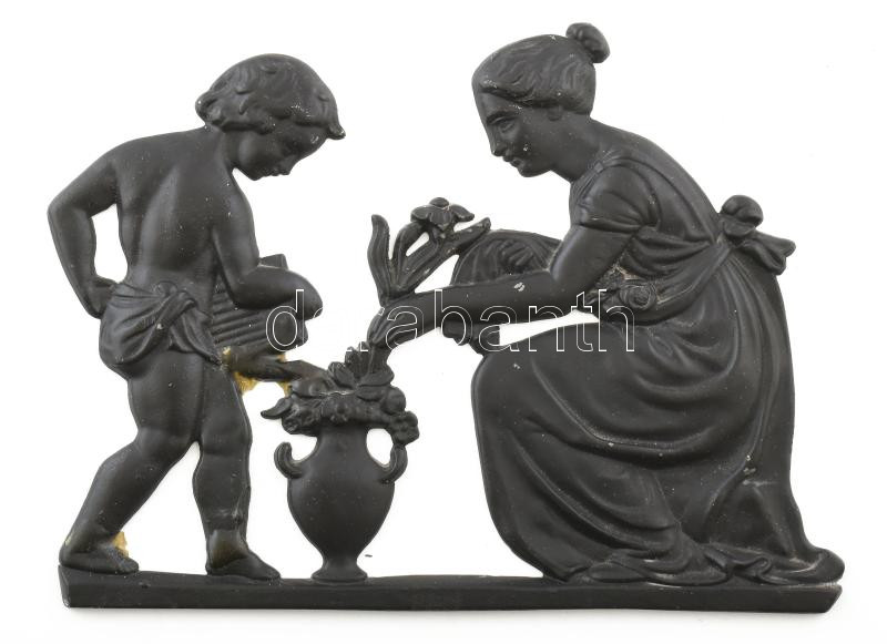 Kertészkedő család, fém dombormű, német, kopással, 20x15cm