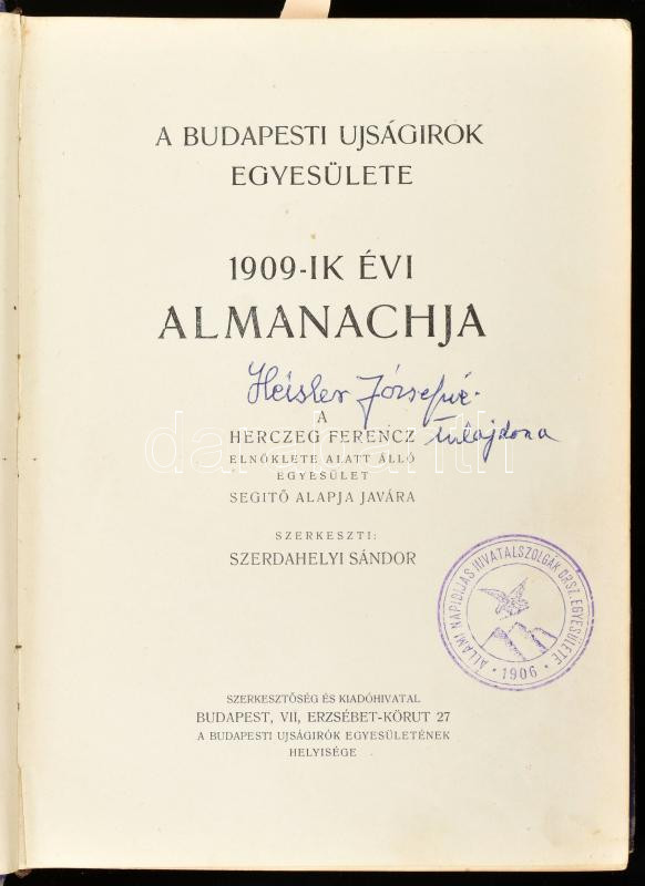 A Budapesti Újságírók Egyesülete 1909-ik évi almanachja. Bp.,1909, Bud... https://www.darabanth.com/en/445-Online-auction/445.0/Books/Books-Other-rarities~1500028/A-Budapesti-Ujsagirok-Egyesulete-1909-ik-evi-almanachja-Bp-1909-Budapesti-Ujsagirok-Egy~II2940940