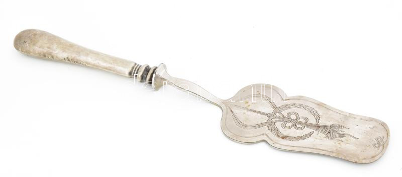Ezüst (Ag) nyelű tortalapát, jelzéssel, h: 29 cm, bruttó: 105 g