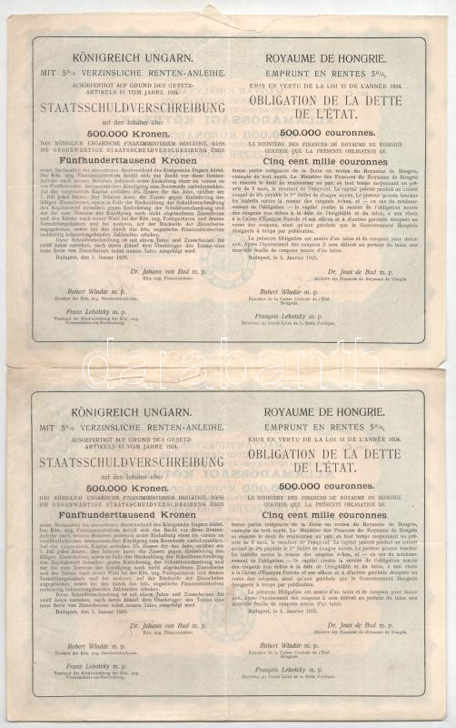 Budapest 1925. "Magyar Királyság 5%-kal kamatozó Járadékkölcsön Államadóssági Kötvény" 500.000K-ról (2x) + 1.000.000K-ról (2x) T:F