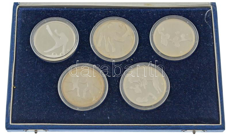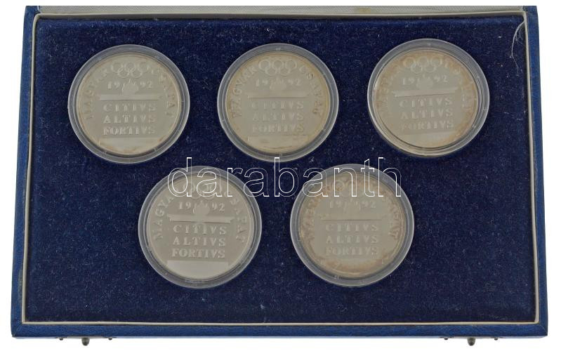 Description: Papp László (1947-) 1992. "Barcelonai Olimpia - Magyar Csapat" teljes sor, (5xklf) Ag emlékérmek eredeti dísztokban, tanúsítvánnyal (31,5g/0.925/42,5mm) T:AU (PP) patina